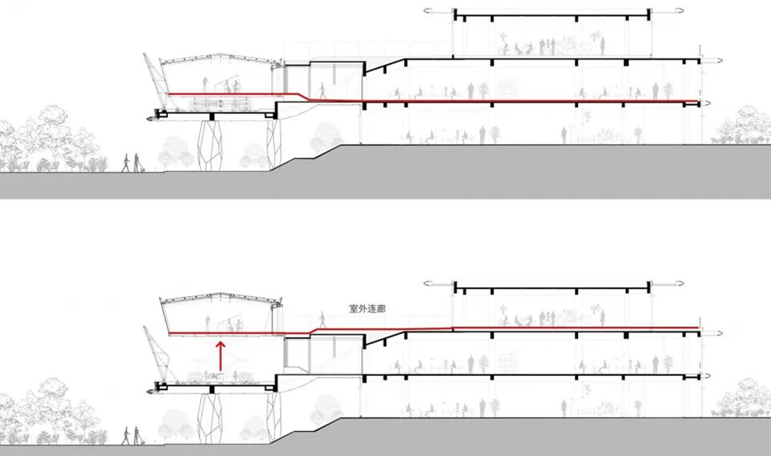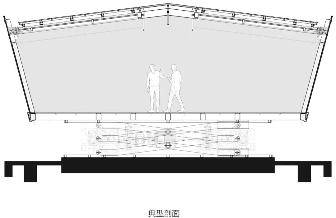 建筑的整體概念,即通過主體空間的升降分別對(duì)應(yīng)觀景/會(huì)談兩種活動(dòng)和展示/隱匿兩種建筑形態(tài)。在單體層面,它是集成型的可響應(yīng)系統(tǒng),通過工業(yè)裝置的設(shè)計(jì)思路,我們首先確認(rèn)了建筑整體將由主體空間和可動(dòng)機(jī)械裝置構(gòu)成,并根據(jù)垂直方向上位移來改變主體空間與東側(cè)建筑不同樓層的連接關(guān)系,完成兩種流線的切換。