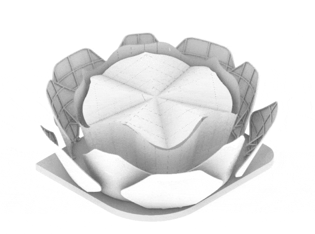 在形態(tài)深化階段,我們希望在模塊化設(shè)計(jì)與標(biāo)準(zhǔn)化組件的建筑裝置化路徑中尋求具有普遍辨識(shí)度的形態(tài)意象,以此加強(qiáng)與城市公眾的共鳴與互動(dòng)。可開合外表皮在可操作范圍內(nèi)劃分為九塊,并根據(jù)“花瓣”重合度、開合角度計(jì)算優(yōu)化得出外層四片(7m*5m)+內(nèi)層五片(6m*6m)的組合方式,并修飾為倒圓角六邊形,,以低透明度ETFE膜作為主材。