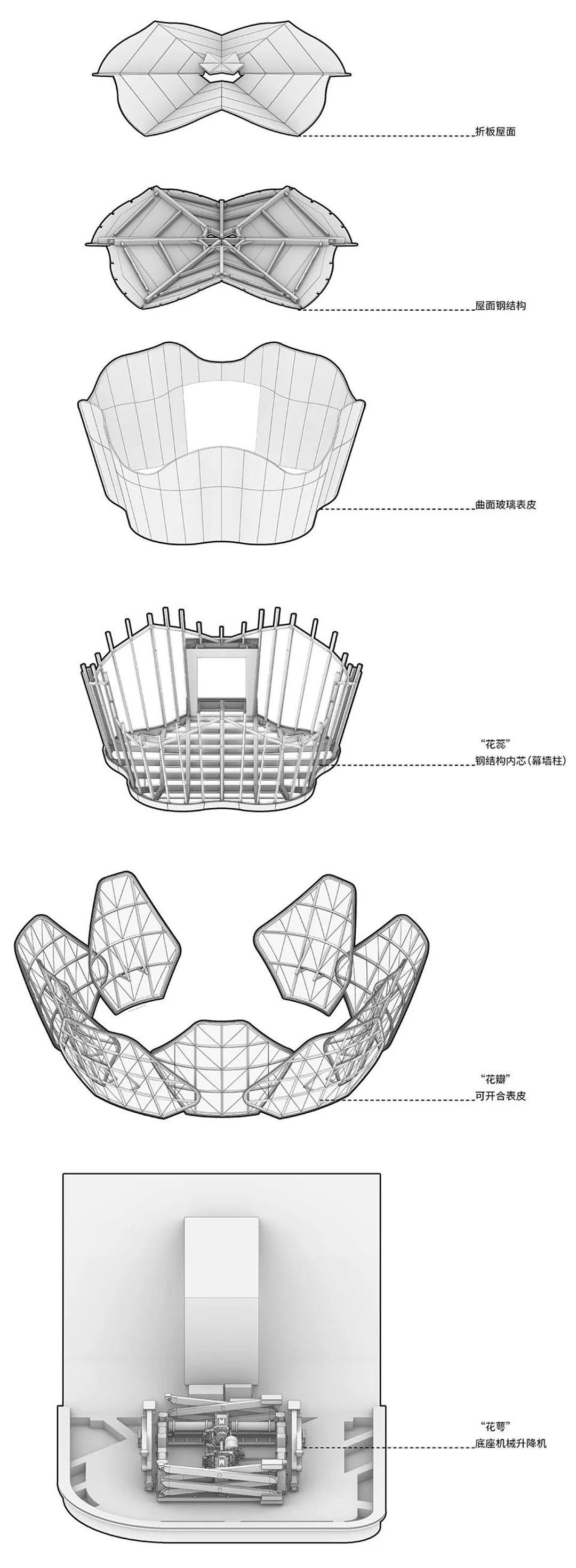 開合表皮系統(tǒng)中的每片花瓣通過雙曲造型鋼架連接底部液壓桿,錯(cuò)層穿插的布置形式實(shí)現(xiàn)有序開合。表皮的動(dòng)態(tài)效果由智能聯(lián)動(dòng)的“電機(jī)+減速器+大回轉(zhuǎn)盤”系統(tǒng)實(shí)現(xiàn),在不同的使用場(chǎng)景下,通過角度和速度的程序設(shè)定,可實(shí)現(xiàn)花瓣不同層次的開放狀態(tài),從而切換建筑的使用場(chǎng)景,并動(dòng)態(tài)回應(yīng)周邊在建的辦公和居住單元的觀景價(jià)值需求,避免長(zhǎng)時(shí)間遮擋其視覺通廊。