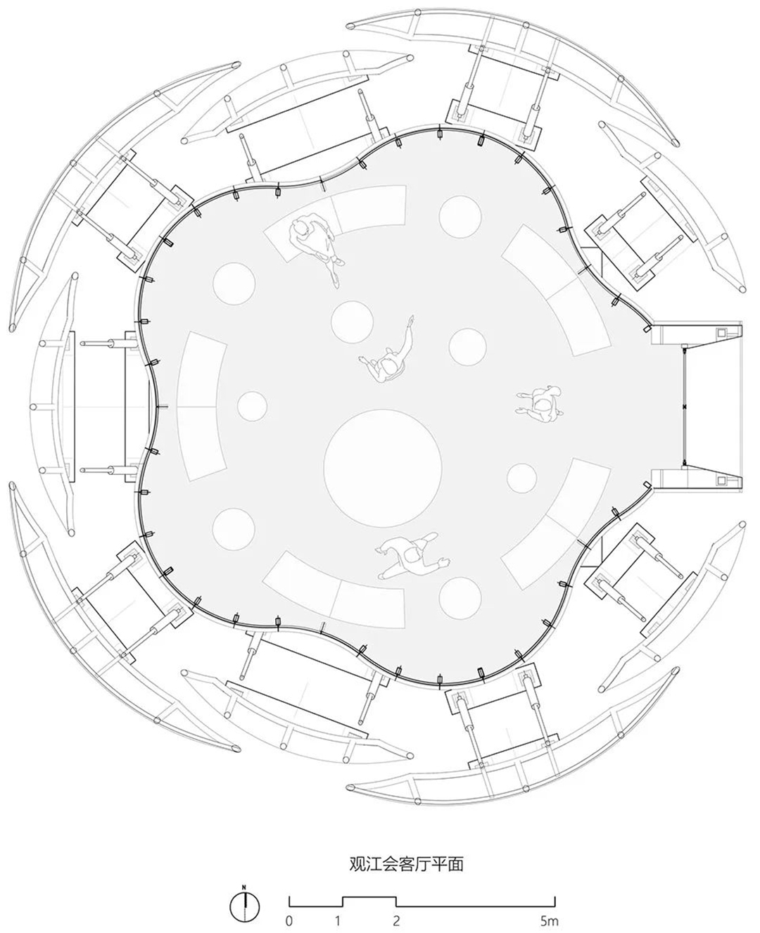 “湘江之眼”位于長(zhǎng)沙湘江畔,作為城市會(huì)客廳,兼具城市觀景和區(qū)域地標(biāo)的雙重屬性。由于場(chǎng)地受到沿江岸植被遮擋等限制,需達(dá)到足夠高度以滿足觀景和地標(biāo)兩大訴求。但若一味抬高,也存在遮擋周圍建筑視線,損害江景社區(qū)商業(yè)價(jià)值的問題。另一方面,內(nèi)部空間需適應(yīng)業(yè)主對(duì)不同場(chǎng)合下的場(chǎng)景切換,對(duì)私密性與開放性有多變的特定要求。一系列看似相互矛盾的限定條件,在梳理之后的破題切口,均指向了動(dòng)態(tài)可變的場(chǎng)景訴求。