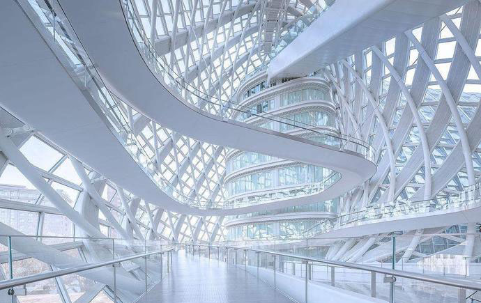 整個莫比烏斯環的幕墻由4943塊完全不同的玻璃組成,懸掛在“沒有一條是直的”的鋼梁之下。為了表現莫比烏斯環連續扭動的形體特征,設計團隊打造出了一套融合結構力學和美學表現力的全新結構體系——雙向疊合網格結構。