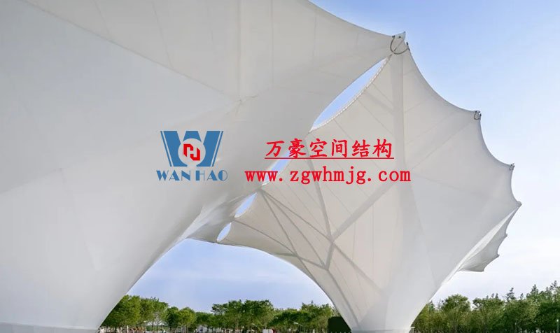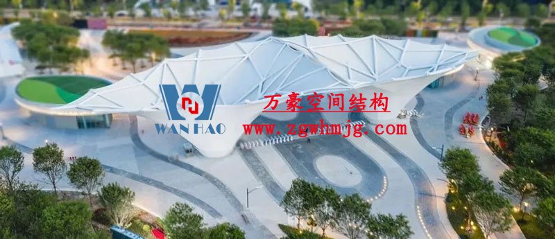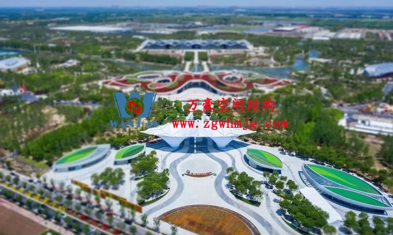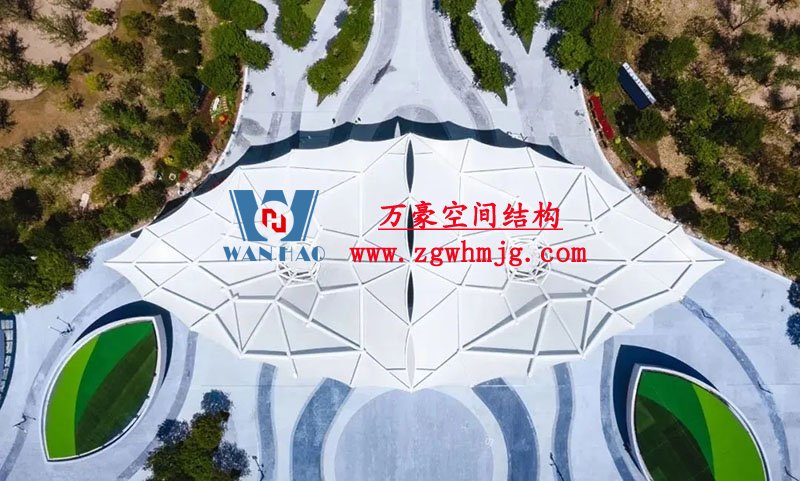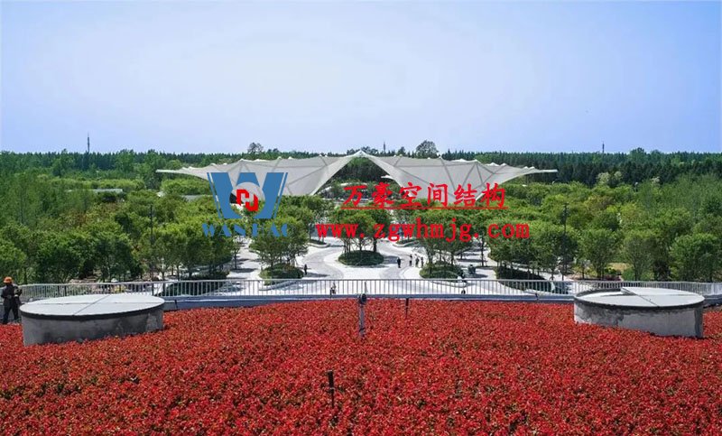 花博園北園的主入口構筑物,是全新“仿生鋼結構骨架外掛柔性幕墻”膜結構,既形似兩棵枝繁葉茂的大樹、又勝似兩朵盎然怒放的白玉蘭。仿生鋼結構體系大門高19.21米,寬100米,寓意中國共產黨建黨一百周年。