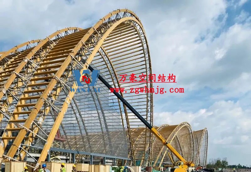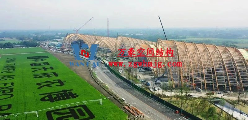 農(nóng)博主展館項目五個館,共有77個巨型木拱,跨度高度均不相同,節(jié)點類型繁多,設計難度大。其中最大一拱跨度為118米,最高為43.25米。目前天府農(nóng)博主展館項目已經(jīng)雛形初現(xiàn),遠遠望去,猶如稻浪翻涌起伏震撼人心。