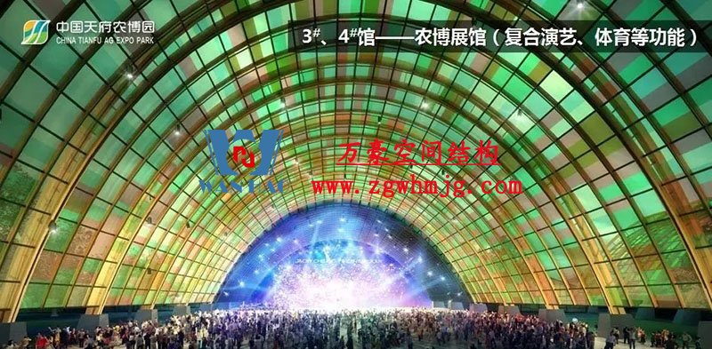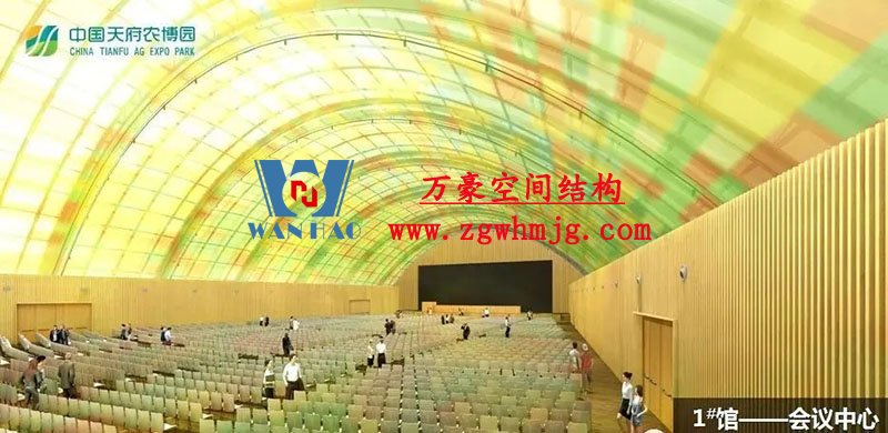 主展館項目采取世界首創(chuàng)的鋼木混合空腹桁架拱(鋼木結構),整體為CNC加工木拱+單層ETFE 膜結構體系,這座長在田野中的巨型建筑,在工程技術上運用了許多在成都,乃至國內(nèi)都少見的高新技術、高級材料。