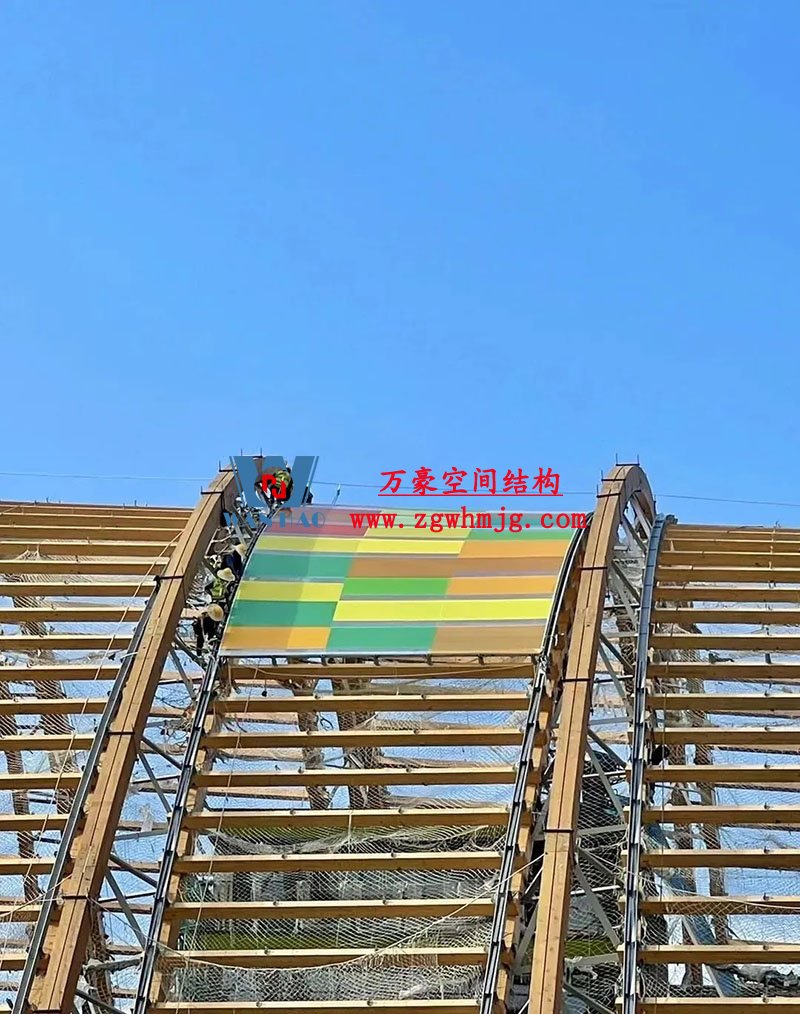 屋面為德國進口ETFE膜,這種膜的承重能力強,僅僅0.25毫米的厚度。膜片數(shù)量多、顏色多,通過采用參數(shù)化建模技術、加工圖數(shù)字化自動出圖等措施,達到設計規(guī)則統(tǒng)一、安裝快捷高效的效果,最終呈現(xiàn)五彩斑斕的表面,表達積極、健康、豐收的景象。