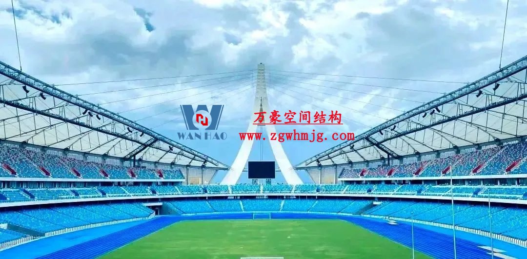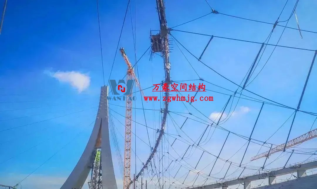 “‘豎琴’與‘天傘’的交相輝映”是對斜拉索桁柔性罩棚受力體系的形象描述。兩座高達99米“人”字形索塔一端拉起18根斜拉索,另一端連接8根背索,猶如兩把空中“豎琴”將索桁架罩棚輕輕吊起,在大跨度張拉中演奏一曲建筑贊歌。