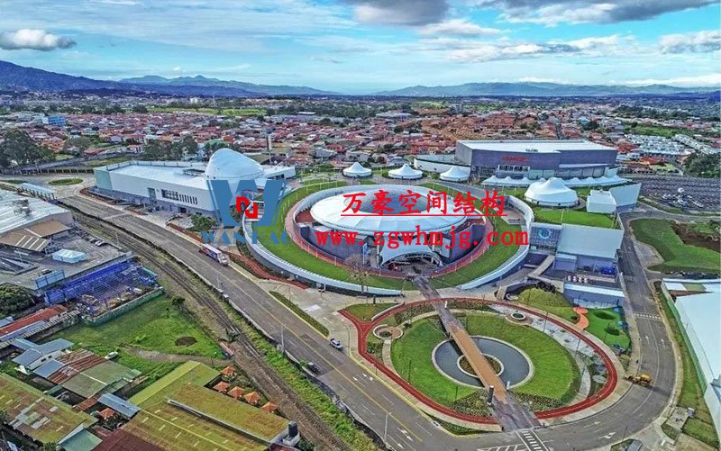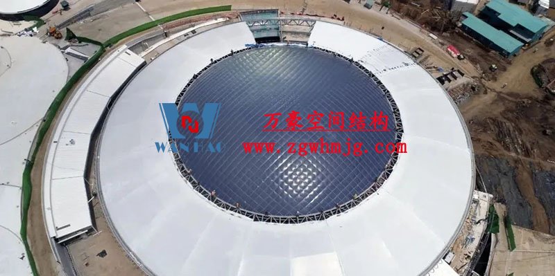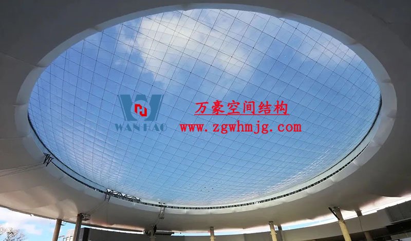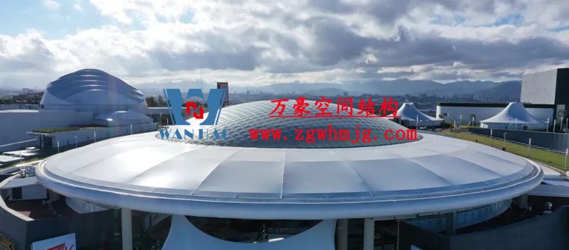 其中,美食廣場的屋面采用ETFE氣囊式膜結構。氣囊直徑45m,投影面積1600m²,ETFE膜材厚度0.25mm。采用索網加強,索網的網格尺寸1.2m。