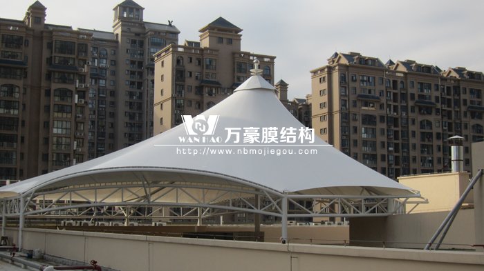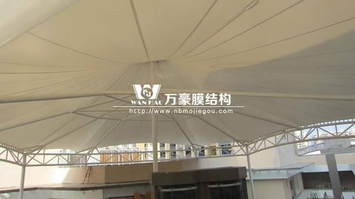 本工程總建筑面積約900平方米,主體一根主柱、九根支柱,四周單片桁架連接,總體一個帽柱,直線長為26.9米,帽柱總高33.6米,寬為27.8米。因為本工程坐落在商業區中心,四周都是五層商鋪,吊車無法進入施工現場,先用25噸吊車把材料送到五層樓房頂,后用人工或手拉葫蘆進行運送和安裝。施工范圍包括鋼結構系統與膜材系統的制作和現場安裝施工,現工程已經完工。