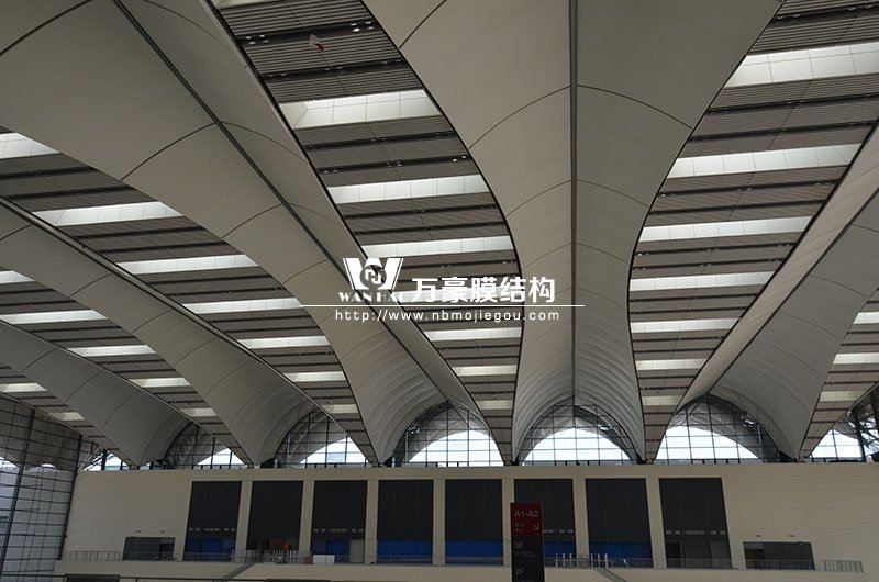 青島紅島國際會議中心幕墻膜結構工程,由寧波萬豪空間結構工程有限公司承建,現場測量、深化設計、制作及安裝由寧波萬豪全權負責。該工程用鋼量1000多噸,PTFE室內屋面膜結構展開面積17000多平方米,PTFE室外屋面膜結構展開面積20000多平方米。