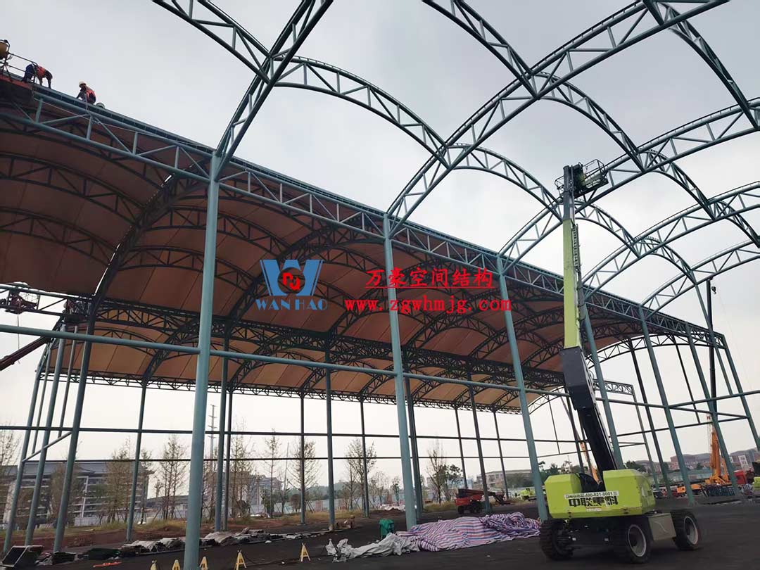 四川廣安共享體育場網球館膜結構位于廣安區官盛新區,是廣安共享體育場的一部分,PTFE膜結構展開面積5500平方米