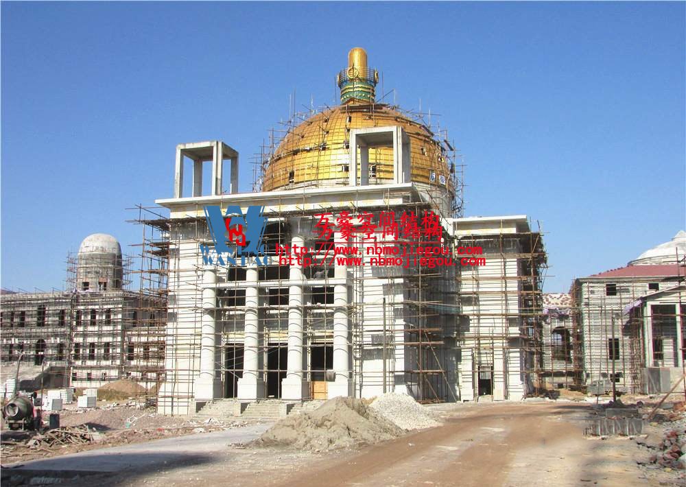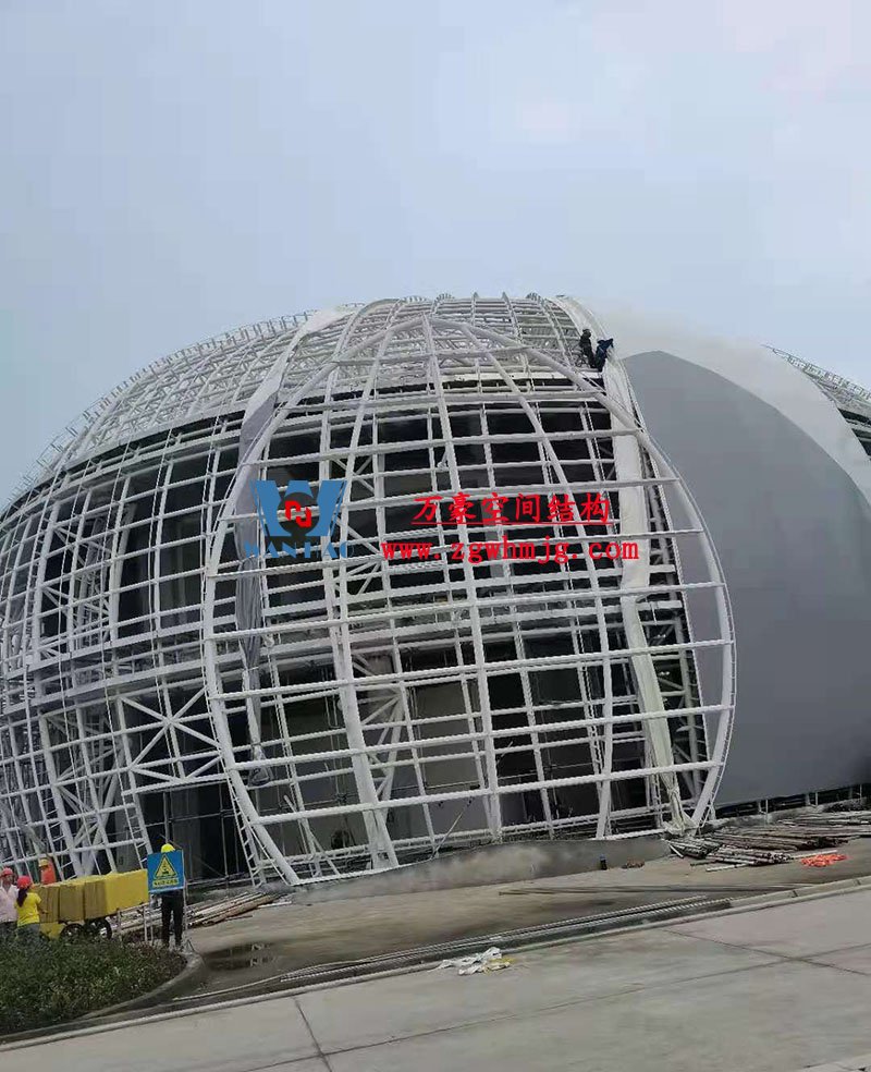 項目概述 - | 整個穹頂主結構由48根弧形鋼結構勾勒而成,外表面采用8000多塊金色鋁板拼裝完成,由于該項目為圓頂結構,每條緯線部分的每塊鋁板大小各異,因此對主結構加工、安裝精度要求極高... |