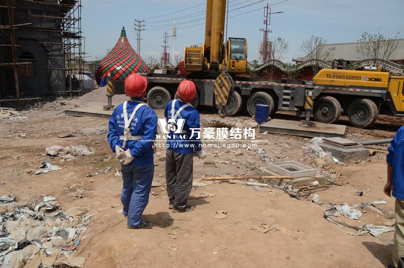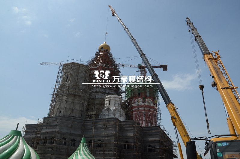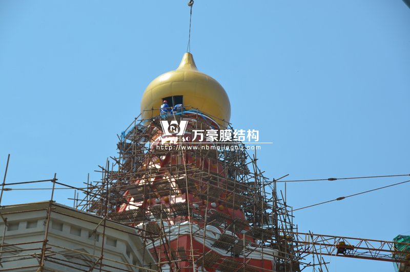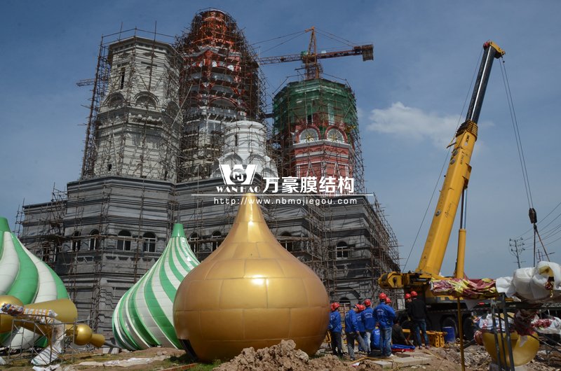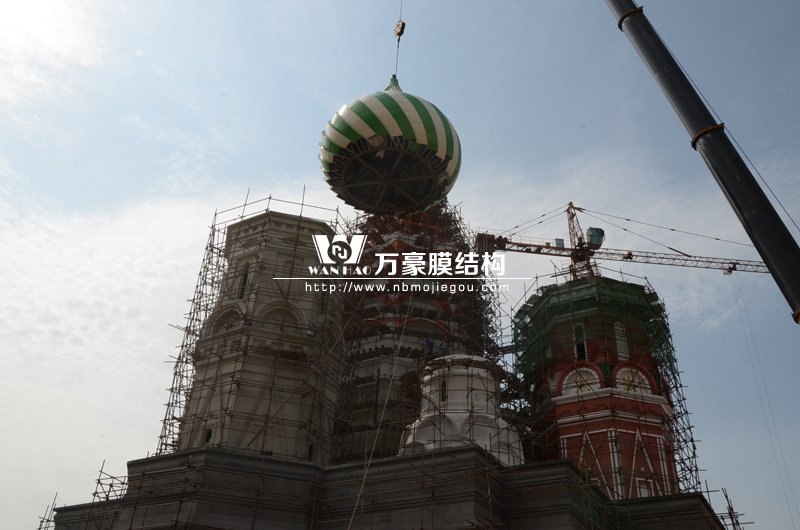 我司承建的橫店影視城圓明新園俄羅斯館已經(jīng)進(jìn)入頂部吊裝階段,本次吊裝難度極大,有著重、高、精等特點(diǎn)。本次吊裝的球體采用鋼結(jié)構(gòu)骨架和鋁合金外殼組成,自重很大,同時球體在吊裝過程不能變形,對球體前期的設(shè)計(jì)制作要求高,因其重量大,所以使用了大噸位吊車。本次吊裝高度高,很多都是高空作業(yè)。同時本次吊裝精度要求高,需要球體和底座按照設(shè)計(jì)要求完美結(jié)合,一次性完成吊裝,需要吊裝人員做好協(xié)調(diào)溝通工作,配合毫無誤差。4月17日天氣晴朗風(fēng)速低,是吊裝的有利天氣,首先吊裝相關(guān)人員設(shè)備做好準(zhǔn)備工作,之后先吊裝1號球體,在1號球吊裝完畢無誤固定后再吊裝5號球體,當(dāng)天吊裝好1號球體和5號球體。