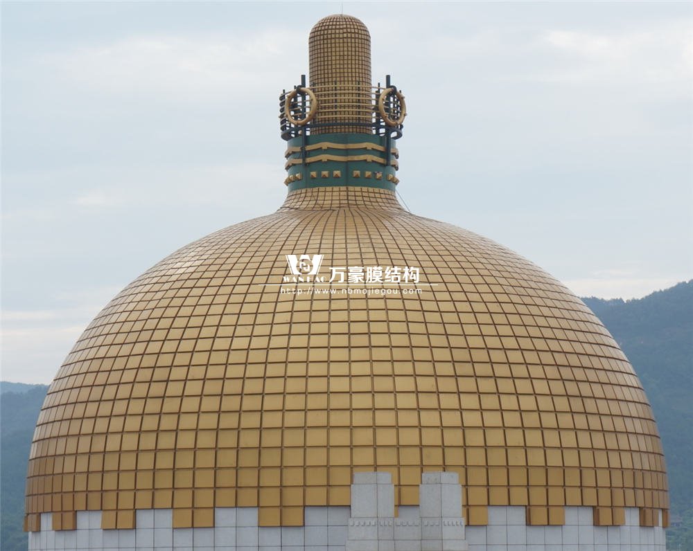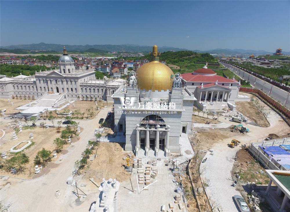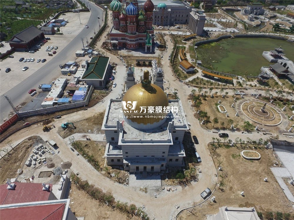 項(xiàng)目坐落于浙江省東陽市橫店影視城圓明新園皇家園林內(nèi),奧地利館穹頂結(jié)構(gòu)呈現(xiàn)出一個(gè)鍍金大圓頂,完美重塑奧地利施坦霍夫教堂這個(gè)奧地利新藝術(shù)派令人驚嘆的建筑藝術(shù)杰作。