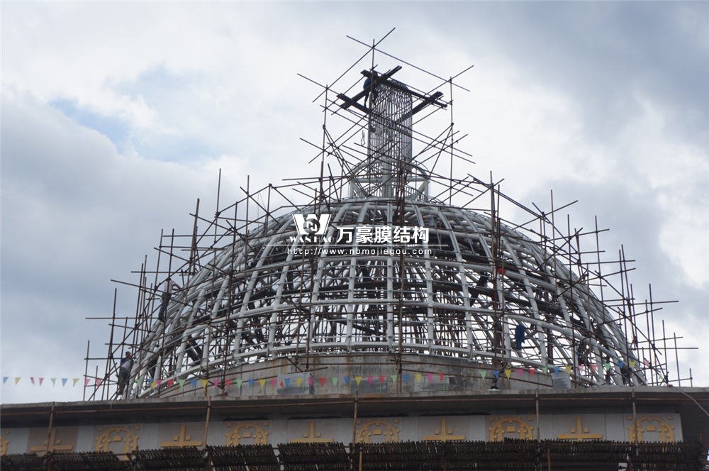 整個(gè)穹頂主結(jié)構(gòu)由48根弧形鋼結(jié)構(gòu)勾勒而成,外表面采用8000多塊金色鋁板拼裝完成,由于該項(xiàng)目為圓頂結(jié)構(gòu),每條緯線部分的每塊鋁板大小各異,因此對主結(jié)構(gòu)加工、安裝精度要求極高,現(xiàn)場以一個(gè)平面控制網(wǎng)和48個(gè)徑向平面組成控制系統(tǒng),即以平面代替三維空間,來達(dá)到精確、快速的測量定位及校正數(shù)據(jù)并順利完成施工。