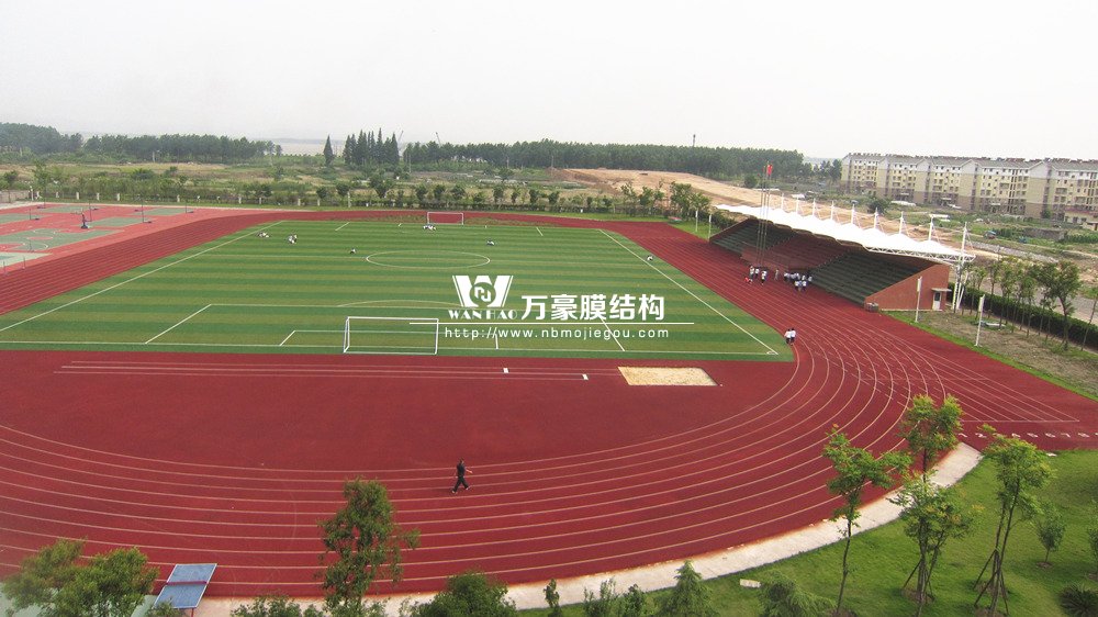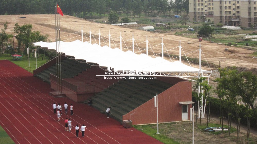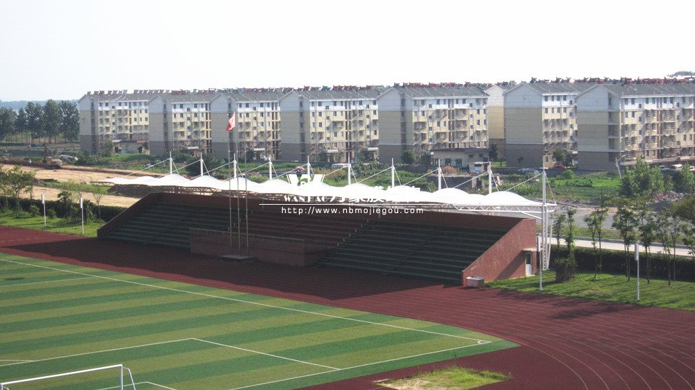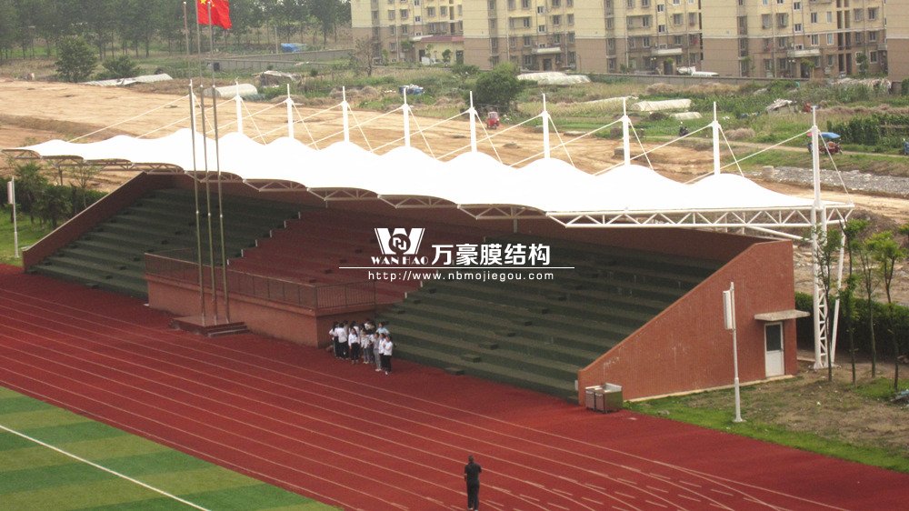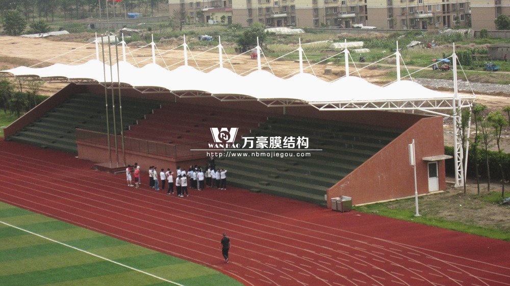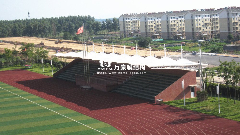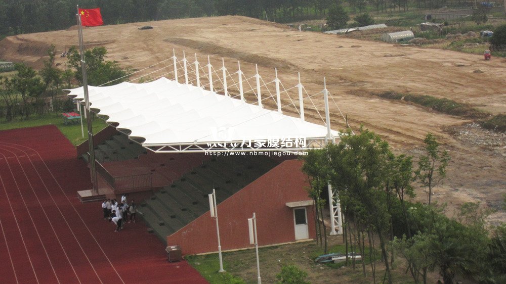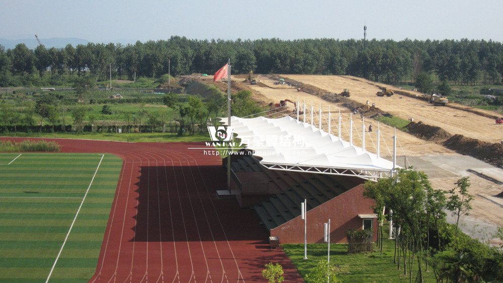 建筑為鋼桁架膜結構立體造型,由鋼管立體柱、三角桁架組成主體結構,上面采用進口PTFE膜材覆蓋。鋼架標高近20米,鋼構總重約60噸,其中單榀主桁架重約6噸。本項目為碧桂園分校內的一個標志性建筑。該工程看似施工難度不大,但是對于一個已經投入使用多年的學校,操場體育設施及綠化都已經全部覆蓋,成品保護這塊工作是施工唯一的一大難點。所以我公司擬派具有20多年豐富工程施工經驗的項目經理和項目技術負責人親臨現場指揮,施工隊伍的大力配合,最終我們克服了種種困難,完成了這一偉大的項目。