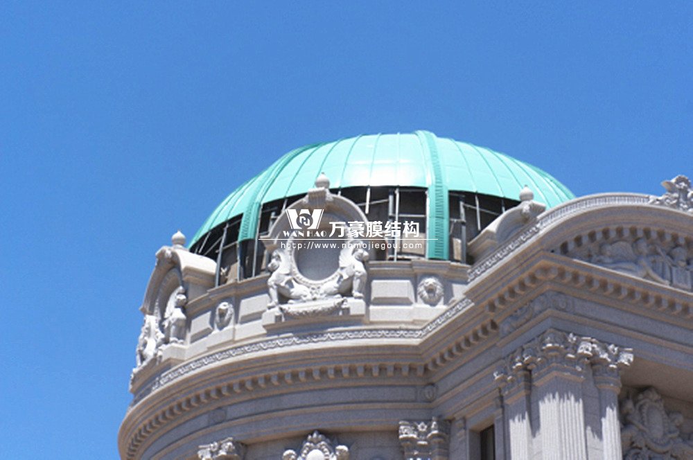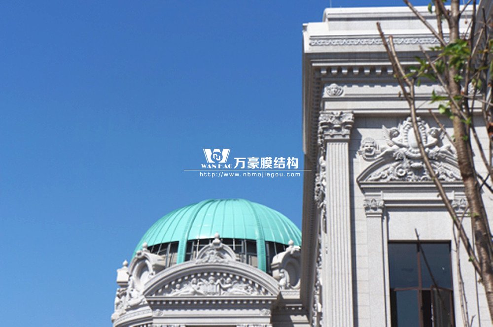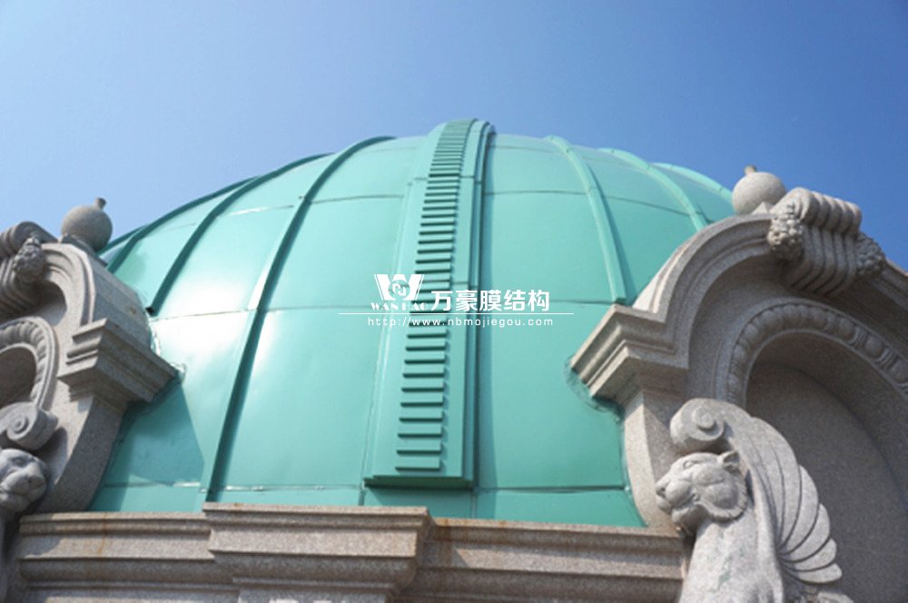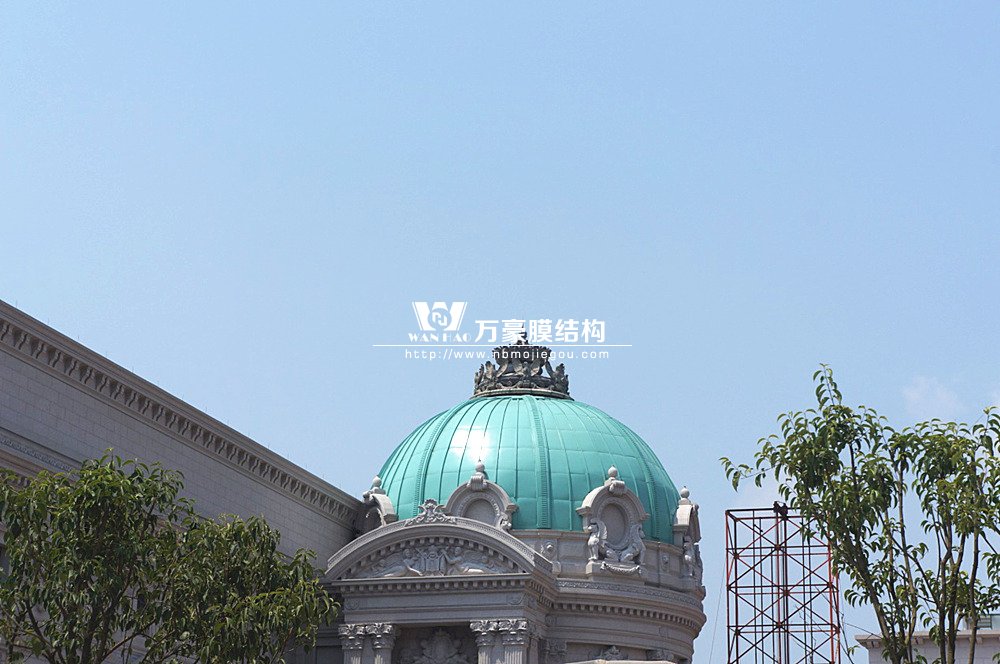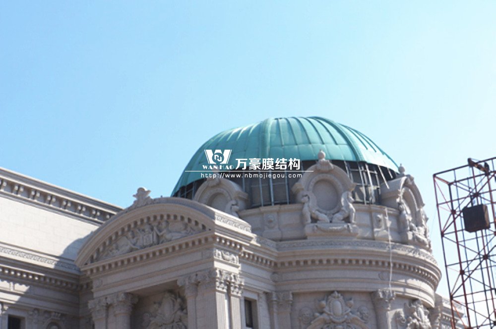 豪華的像是一個首飾盒,裝滿了各種珠寶的巴黎歌劇院目前重塑于橫店影視城圓明新園皇家園林內,其中兩側的銅綠穹頂宛如畫龍點睛般凸顯其精致、雄偉。兩個穹頂結構相同并對稱,穹頂主結構采用相同弧形彎管拼裝而成,結構表面采用480塊大小各異的鋁單板組裝而成。