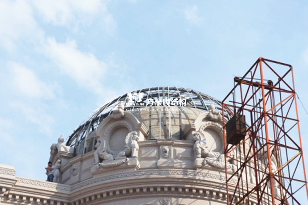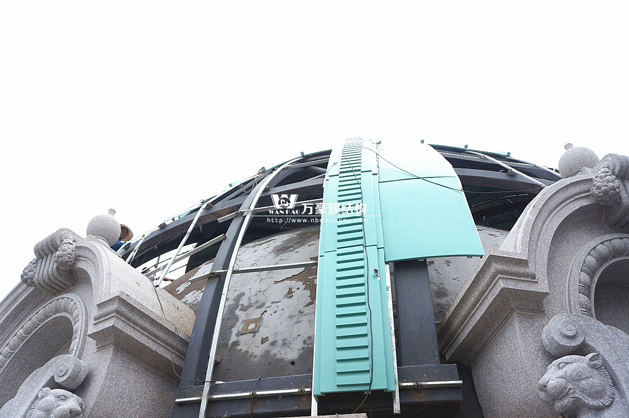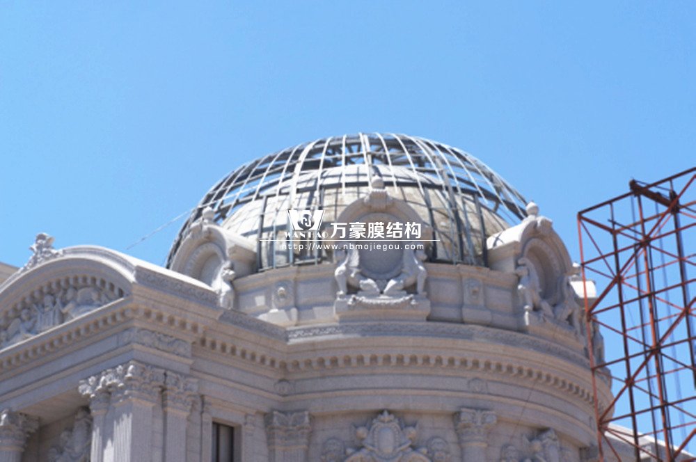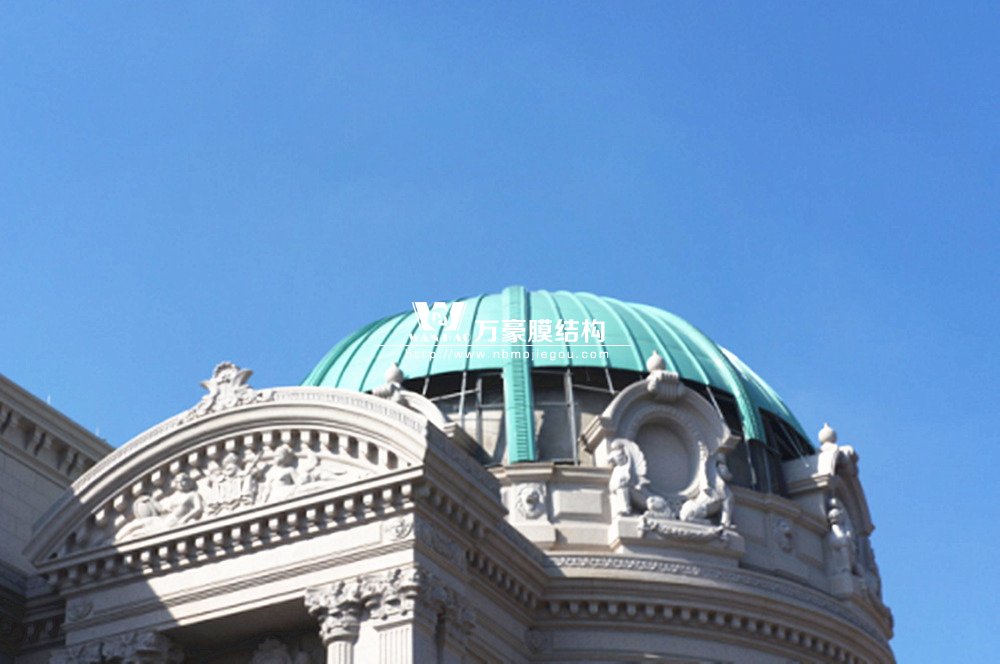 豪華的像是一個首飾盒,裝滿了各種珠寶的巴黎歌劇院目前重塑于橫店影視城圓明新園皇家園林內,其中兩側的銅綠穹頂宛如畫龍點睛般凸顯其精致、雄偉。兩個穹頂結構相同并對稱,穹頂主結構采用相同弧形彎管拼裝而成,結構表面采用480塊大小各異的鋁單板組裝而成。