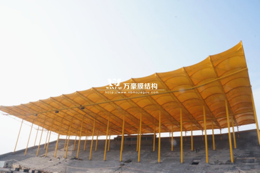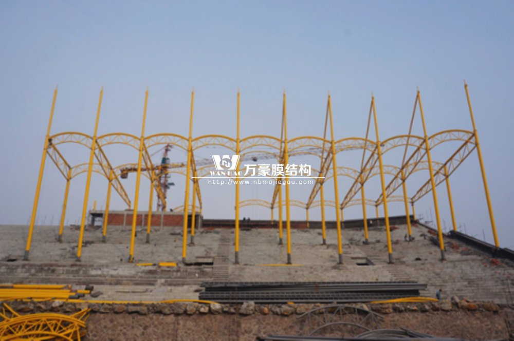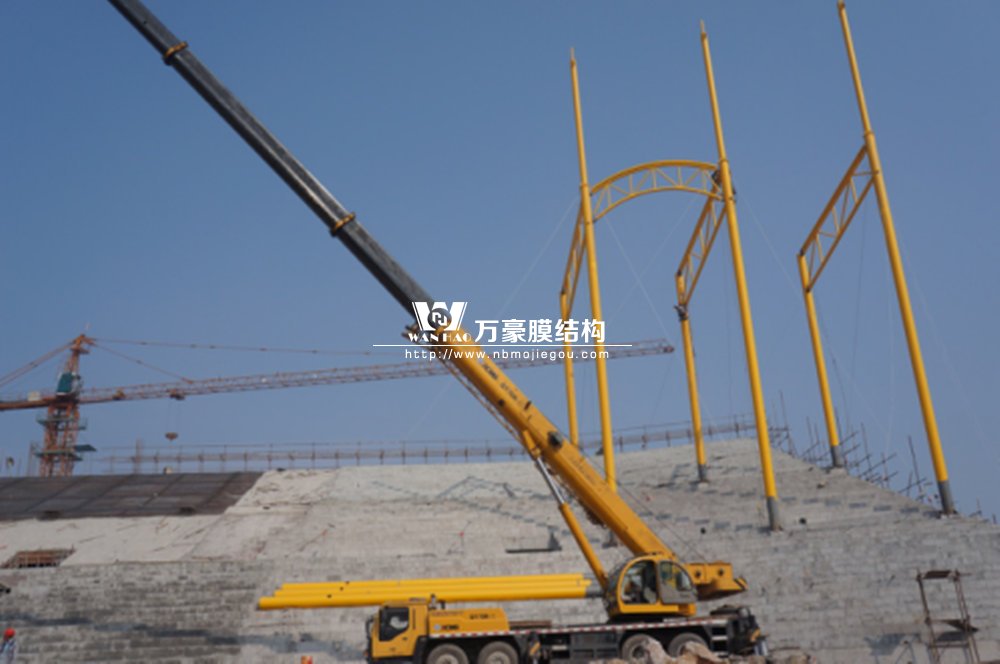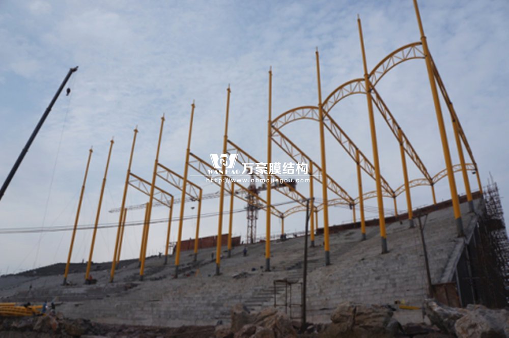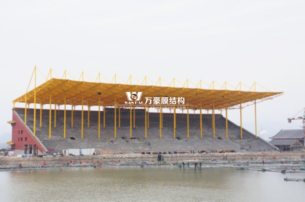 橫店影視城被一圈連綿起伏的山巒包圍著,層疊的遠山宛如水墨畫。圓明新園則位于小鎮(zhèn)西邊的山巒中,芳草萋萋、溪水潺潺!花仙湖膜結(jié)構(gòu)看臺坐落于圓明新園春苑東北角,為骨架支撐式膜結(jié)構(gòu),建筑面積約為16000㎡,看臺主體結(jié)構(gòu)可分為15個單元,屋面膜結(jié)構(gòu)則由30片膜組成。主體結(jié)構(gòu)劃分為四大部分:鋼柱、主桁架、次桁架和馬道。鋼柱高34.76米,單個重量達8.2噸;主桁架長70.66米,柱間距15米,看臺屋面猶如浮動的金色流云,徜徉在花仙湖上空。此項目為全國最大的“水戲”表演建筑的看臺,同時也是水上樂園彩色膜結(jié)構(gòu)最大的一個景觀。