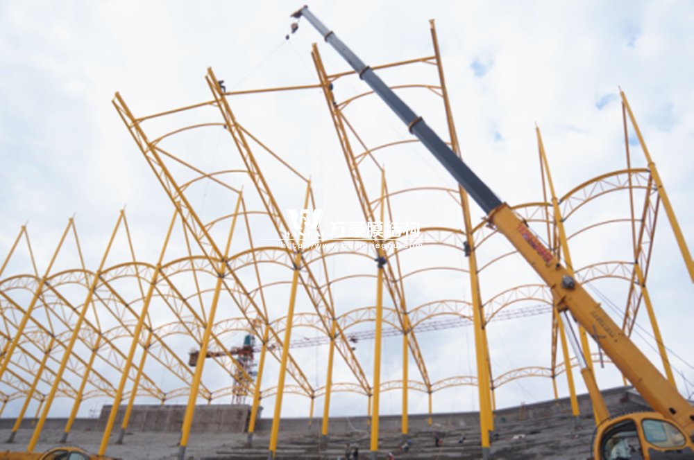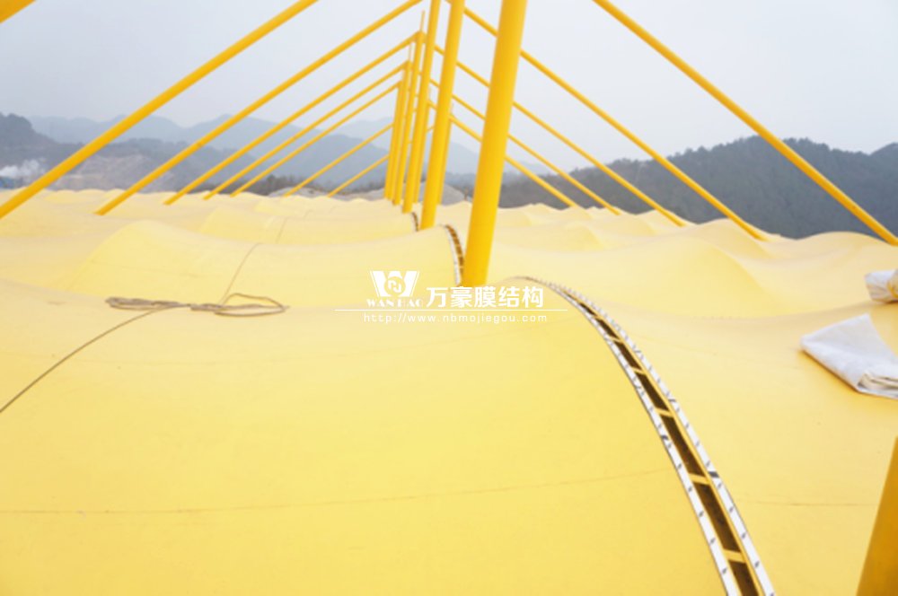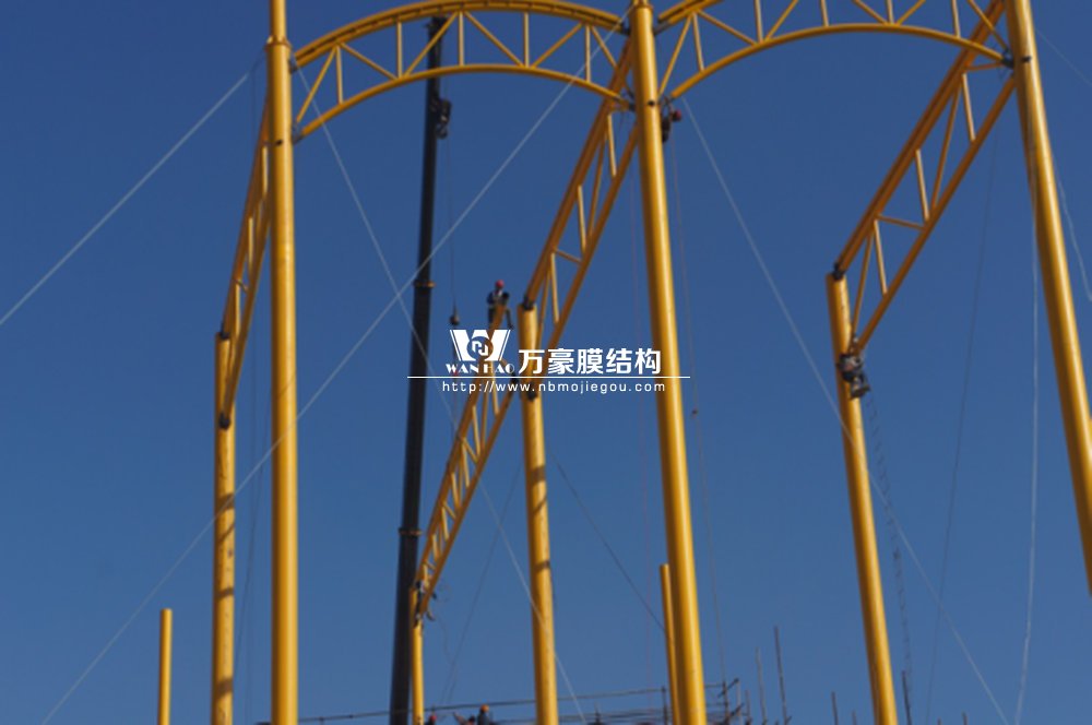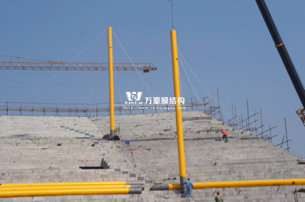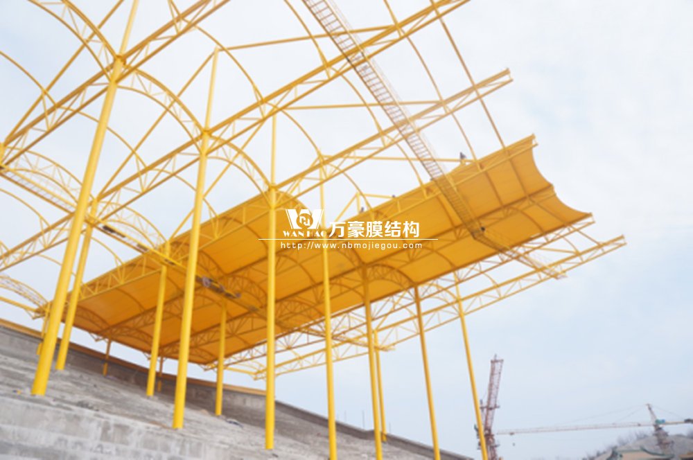 橫店影視城被一圈連綿起伏的山巒包圍著,層疊的遠山宛如水墨畫。圓明新園則位于小鎮(zhèn)西邊的山巒中,芳草萋萋、溪水潺潺!花仙湖膜結(jié)構(gòu)看臺坐落于圓明新園春苑東北角,為骨架支撐式膜結(jié)構(gòu),建筑面積約為16000㎡,看臺主體結(jié)構(gòu)可分為15個單元,屋面膜結(jié)構(gòu)則由30片膜組成。主體結(jié)構(gòu)劃分為四大部分:鋼柱、主桁架、次桁架和馬道。鋼柱高34.76米,單個重量達8.2噸;主桁架長70.66米,柱間距15米,看臺屋面猶如浮動的金色流云,徜徉在花仙湖上空。此項目為全國最大的“水戲”表演建筑的看臺,同時也是水上樂園彩色膜結(jié)構(gòu)最大的一個景觀。