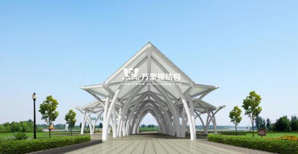 海寧市臨杭新區(qū)龍渡湖景觀綠化一期(張拉膜)工程位于海寧市許村鎮(zhèn)鎮(zhèn)政府以西1.5公里處,人民路以南、錦繡路以西。建筑面積約為1300㎡,長(zhǎng)80米,寬28米,該工程采用PTFE膜材,為整體骨架支撐式結(jié)構(gòu)。許村鎮(zhèn)位于海寧市西端,是海寧接軌杭州的橋頭堡,該工程又位于許村鎮(zhèn)西端,距離杭州市余杭區(qū)2.5公里,在連接許村鎮(zhèn)與余杭區(qū)的主干道人民大道旁,周邊沒(méi)有大型休閑廣場(chǎng),該建筑物已成為當(dāng)?shù)匾粋€(gè)重要景觀休閑場(chǎng)所。