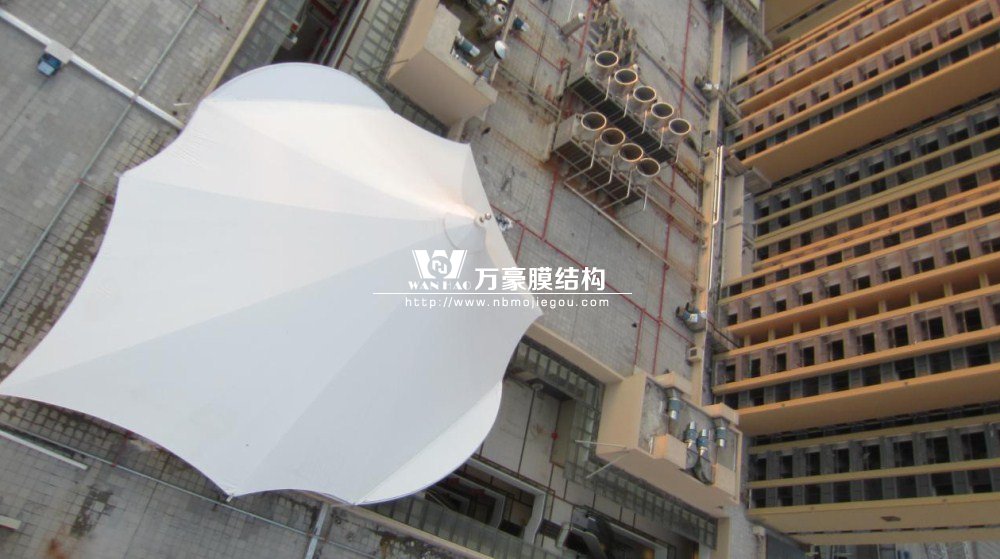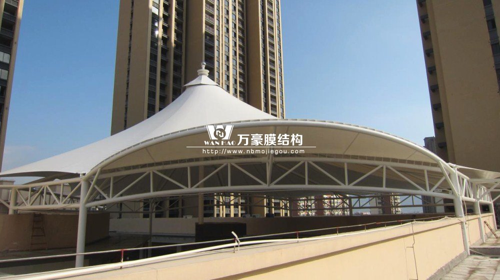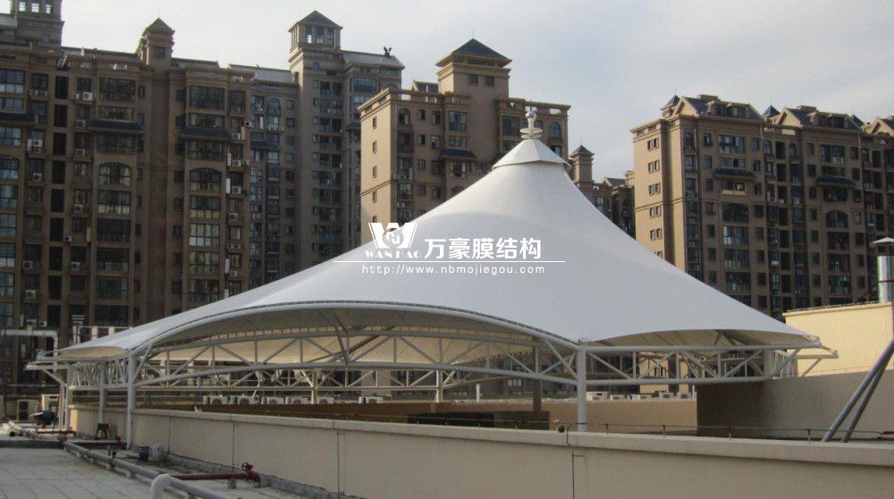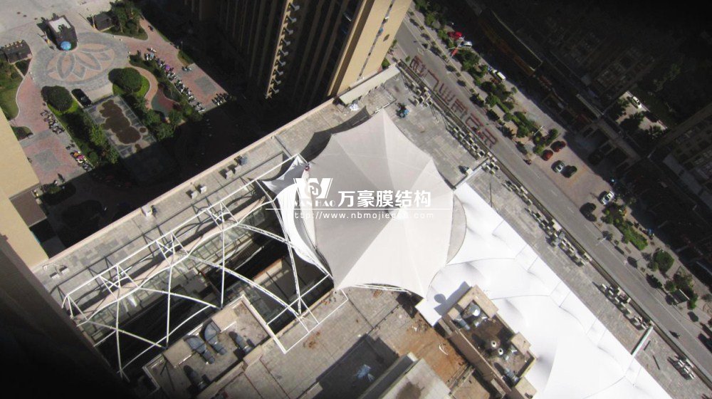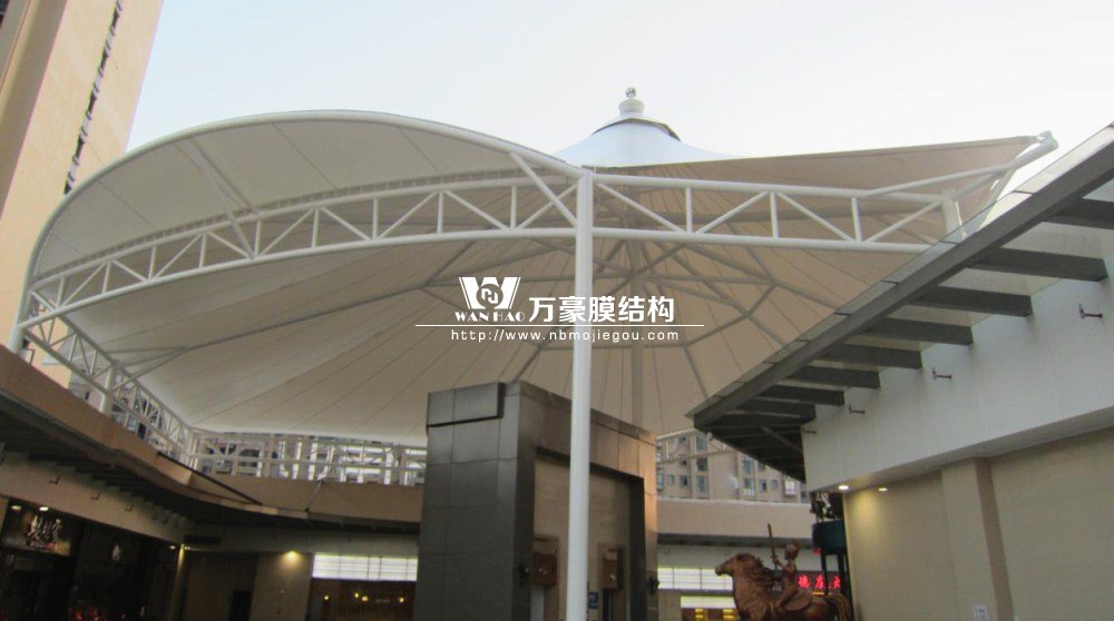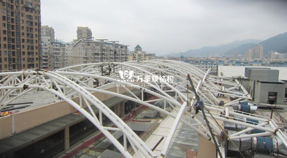 工程是霞浦縣東方偉業(yè)廣場(chǎng)商業(yè)區(qū)加蓋膜結(jié)構(gòu)工程。由于膜結(jié)構(gòu)本身獨(dú)有的特性,除功能性外同時(shí)具有很強(qiáng)的美觀性,較空闊的無(wú)遮擋空間為各種公共場(chǎng)所提供便利。本工程座落在商業(yè)房屋上與周邊環(huán)境相互協(xié)調(diào),具有明顯的建筑可識(shí)別性,以它特有的藝術(shù)感染力和技術(shù),定將成為商業(yè)區(qū)的一大亮點(diǎn)。本工程由三組合(a、b、中),造型不等屋面膜結(jié)構(gòu)組成, 膜材選用意大利進(jìn)口耐馳二氧化鈦1400-3型白色膜材。結(jié)構(gòu)形式以房屋總體造型而定,長(zhǎng)寬高不等造型獨(dú)特很有飄逸感。鋼構(gòu)總重120噸,膜面積3500平方米。