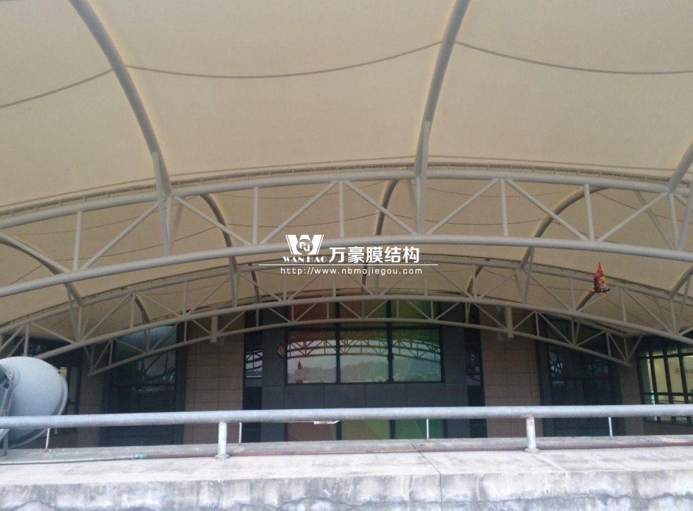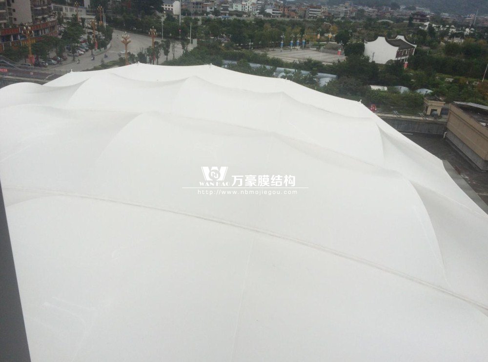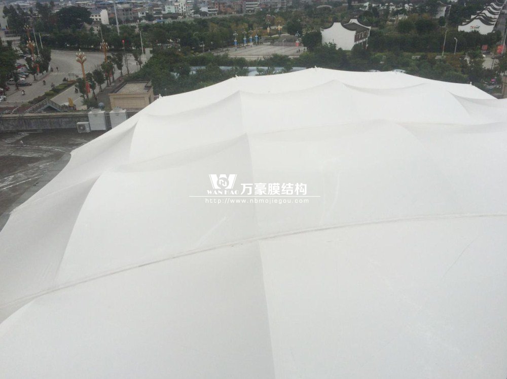 本工程系永輝超市曇石山店中庭頂棚膜結(jié)構(gòu)工程,位于福建省福州市閩侯縣城新區(qū)曇石山西大道3號新永輝超市曇石山店樓頂,該工程為鋼桁架膜結(jié)構(gòu)立體造型,以桁架為主要結(jié)構(gòu)的骨架式單層膜結(jié)構(gòu),上面采用進口意大利耐馳膜材覆蓋。總面積約800平方米,鋼構(gòu)約25噸。該工程施工難度較大,該樓中庭商鋪已經(jīng)投入使用,大型吊車無法進入施工,只能用小型吊車加人工共同來進行施工,還有底下商鋪和地面成品保護和安全也是此次施工一大難點。用了大批的模板保護地面,同時施工時安排了安全督導人員,對客人進行引導。工程完工后,受到了業(yè)主和客人的好評!