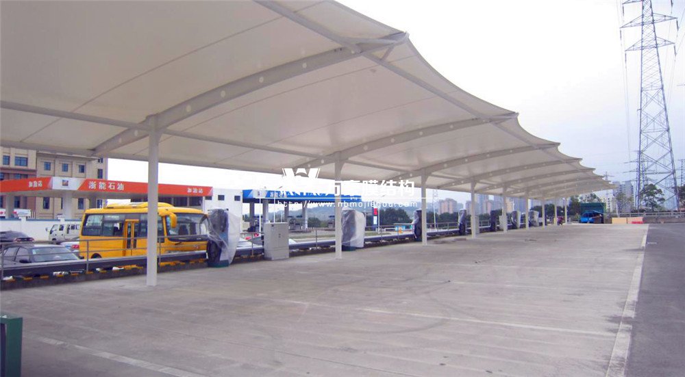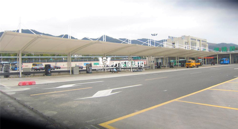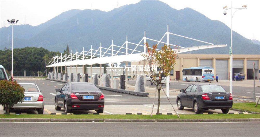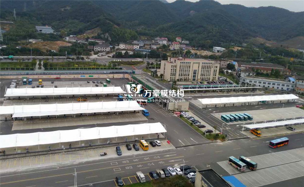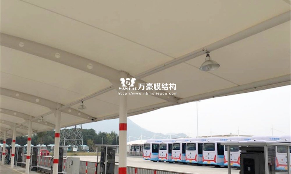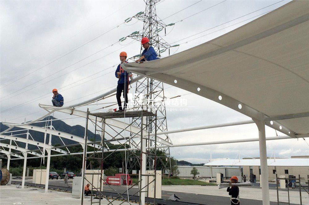 奉化市公交西站膜結構雨棚工程由我司負責施工,位于浙江省寧波市奉化區大成西路的公交西站內,用于電動公交車的充電、???。細分為A、B、C、D、E、F六個區域,其中A、B、C、D四區均為單挑雨棚,E、F兩區為雙挑雨棚。施工面積約5138平方;用鋼量約80噸。施工難點在于工期緊。工程開工時正好是九月末,各個單位都在準備國慶放假,施工方和業主方在施工現場各種情況的了解、交接不夠細致,導致后期施工出現很多問題。臨近道路的幾個基礎施工時需要挖掉一部分瀝青路面,后期的現場恢復時少量的瀝青不容易購買。施工時天氣情況差,連續的陰雨天給鋼構的油漆施工帶來了極大的麻煩并且延誤了工期。雨棚底下還要安裝充電樁,我們還要和充電樁施工班組進行技術對接,規劃充電樁的安裝位置。由于工期緊,天氣狀況差,我們動用了兩個施工班組加班加點,土建、鋼構交叉施工,最后如期完工。由于每個雨棚長度比較長,施工班組在立好鋼構件之后從中間開始往兩邊安裝膜布,使工作效率有了很大的提高。