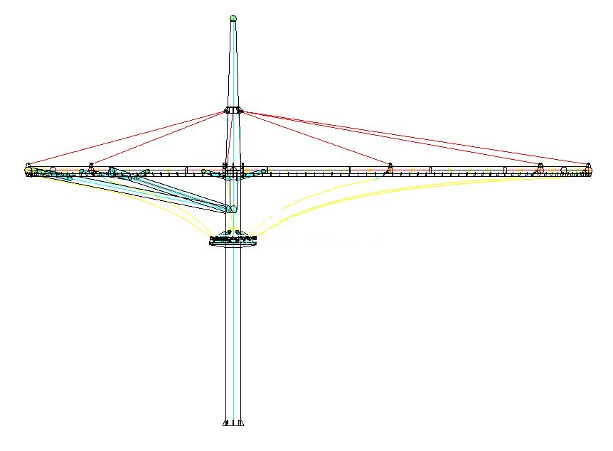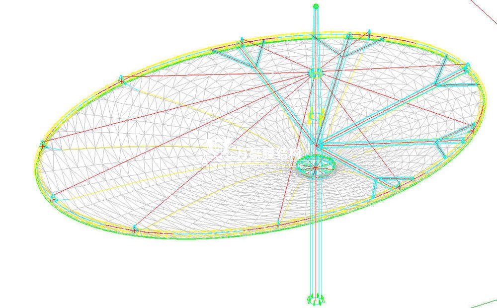 主要材料規格為:基礎為¢960*20柱腳底板,主立柱¢700*16,中間灌C35的膨脹混凝土,錨栓為¢20,鋼架主要材料為:¢165*5、¢114*4、¢325*10、¢219*6,鋼管材質為Q235B,鋼索采用¢20、¢32鍍鋅鋼索,采用法拉利1502t2膜材。