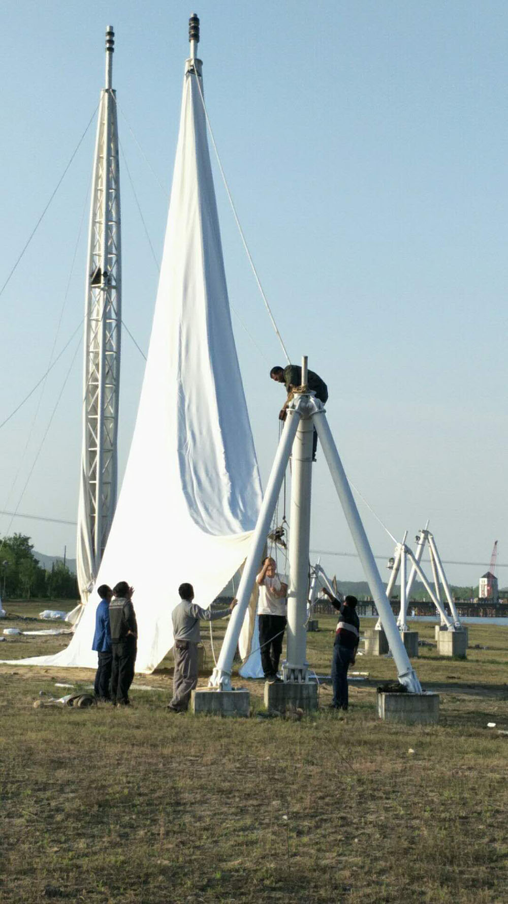 應(yīng)對與高起點(diǎn)規(guī)劃、高標(biāo)準(zhǔn)建設(shè)的原則,寧波萬豪空間結(jié)構(gòu)工程有限公司完美的完成了此次工程。本景觀膜結(jié)構(gòu)安全等級為二級,膜材選用意大利進(jìn)口雙面PVDF超自潔涂層膜材,鋼結(jié)構(gòu)設(shè)計(jì)使用年限20年。總建筑面積約為860平方米,總用鋼量約為27.69噸。桁架、鋼管材質(zhì)均為Q235B鋼,相貫焊接。所有鋼構(gòu)件熱鍍鋅處理,運(yùn)輸、安裝過程中對涂層的損傷,須視損傷程度的不同釆取相應(yīng)的修補(bǔ)方式,對拼裝焊接的部位必須清除焊渣,進(jìn)行表面處理達(dá)到St3級要求后,涂刷環(huán)氧無機(jī)富鋅底漆+環(huán)氧云鐵中間漆+氟碳面漆。