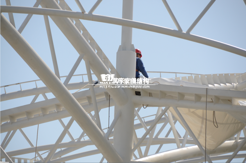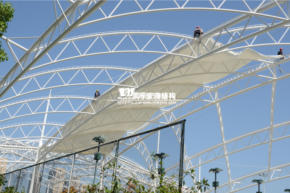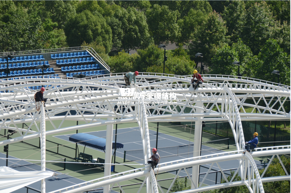 項(xiàng)目為單片網(wǎng)球場罩篷。采用骨架式結(jié)構(gòu)體系,集休閑、運(yùn)動、標(biāo)志性建筑于一體。鋼結(jié)構(gòu)采用Q235B高頻焊管,膜材采用進(jìn)口建筑膜材,顏色為白色。結(jié)構(gòu)包括膜材、鋼管、鋼索、壓條四種材料。膜材緊貼弧拱,四邊通長固定在專用拉膜板上。膜面呈弧拱形平滑過渡,結(jié)構(gòu)流暢簡潔、美觀大方,極富動感,整體建筑造型集實(shí)用功能與景觀于一體,透光與隔熱性能良好,富含現(xiàn)代氣息,氣勢恢弘,彰顯企業(yè)形象。