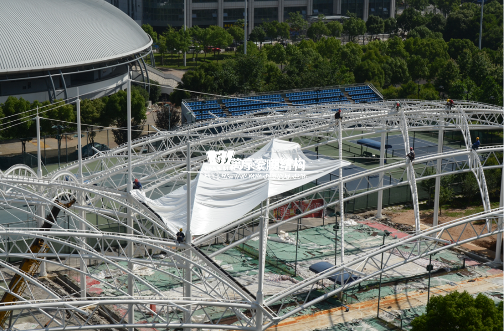 大家還記得寧波(鄞州)網(wǎng)球中心膜結(jié)構(gòu)遮陽棚工程嗎?經(jīng)過緊張的施工,鋼結(jié)構(gòu)已完成并經(jīng)初步驗(yàn)收,膜結(jié)構(gòu)開始安裝,得到了客戶高度的贊賞。