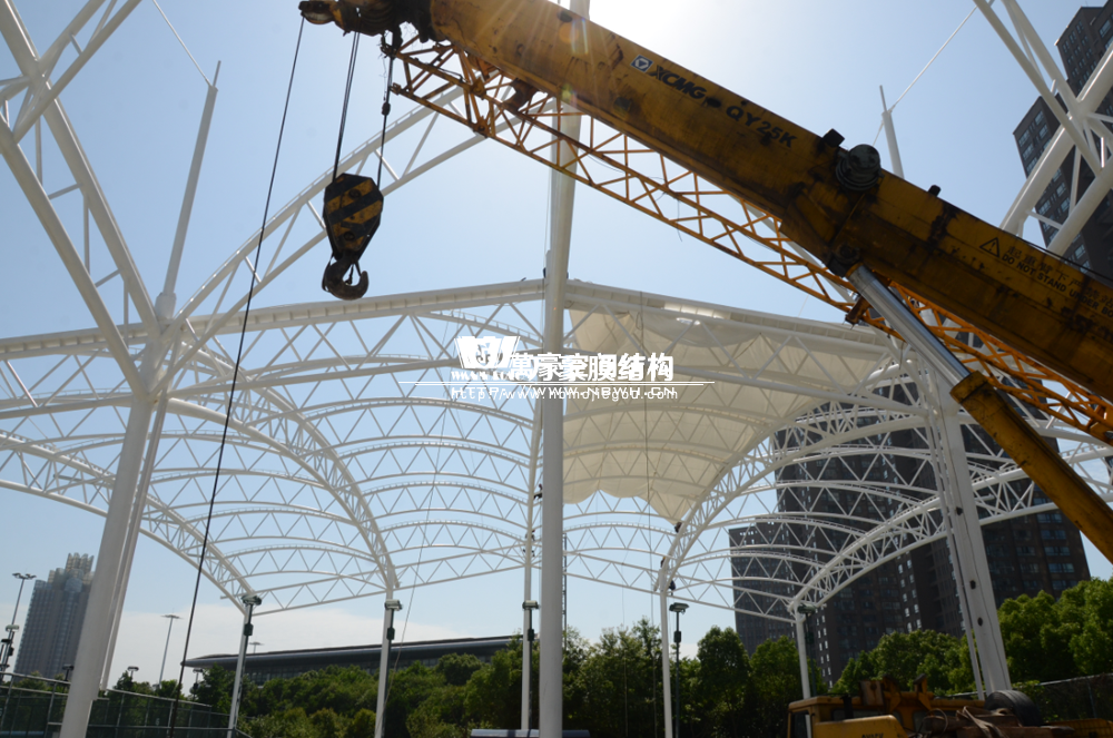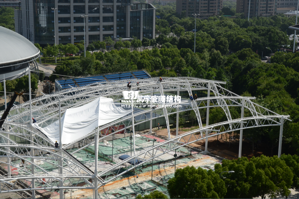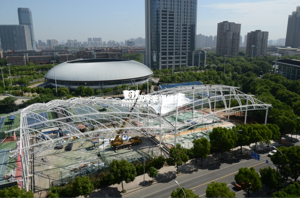 寧波(鄞州)網球中心遮陽棚工程位于寧波市鄞州區首南街道文華路199號【寧波(鄞州)網球中心內】,整個工程用鋼量240噸,膜結構球場展開面積約6000平方米。