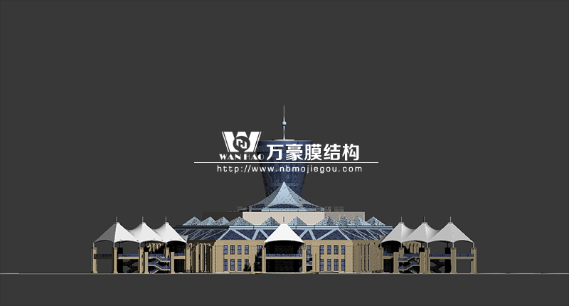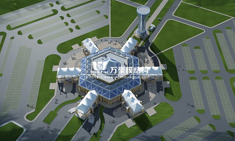 主樓屋頂為六邊形空間結(jié)構(gòu)穹頂,墻面為蜂窩狀幕墻,連廊部分為具有當(dāng)?shù)匚幕厣煨偷哪そY(jié)構(gòu)。