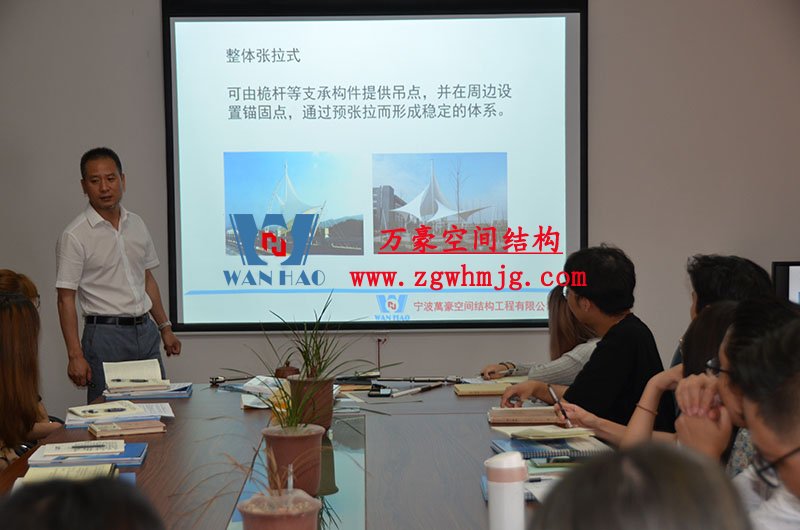 最后,由萬豪總經理張總給大家分享萬豪空間結構企業文化及全面的膜結構工程技術知識。內容包括膜結構行業發展現狀、膜材料分類、膜結構優勢及應用領域、膜結構產品結構形式等。