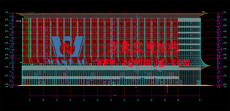 該項目屋面材料選用高自潔PTFE膜材,膜結構展開面積合計20000平米。項目共有256跨懸挑,其中最大懸挑32m,最小懸挑4m。中間由向上托拱聯接而成,后面與鋁板交接,是常規類大型體育場館。