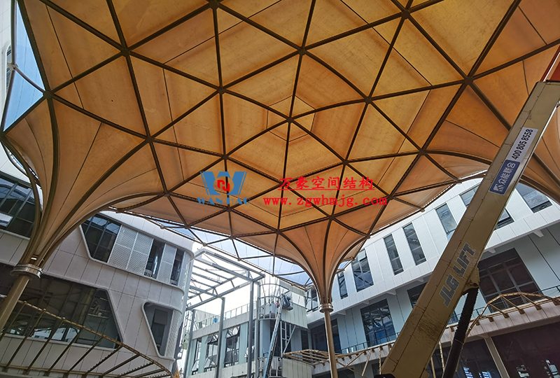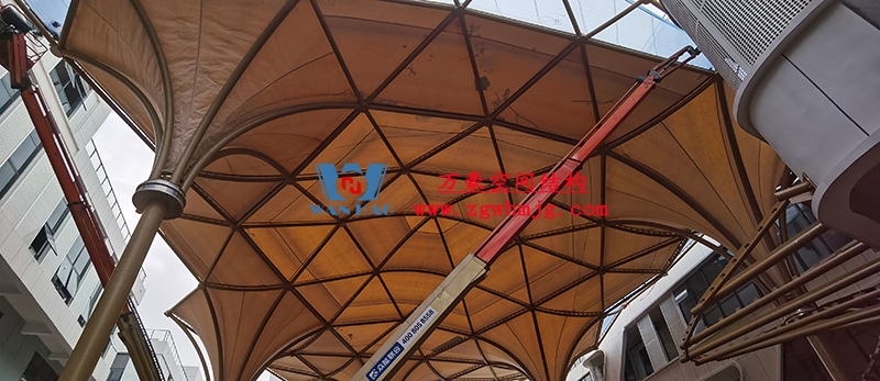 本項目中國—東盟特色商品匯聚中心以(東盟博覽會)為主要議題建設的跨國經濟交流平臺,業主為新加坡著名開發商,對項目品質和工藝有極高的要求和主見,本項目采用了非常規做法,把倒傘狀結構設計于膜屋面下方,仰視穿過空間結構看膜,整體視覺豐富,空間質感效果明顯。此設計施工在倒傘類膜結構中尚屬首例,在景觀天幕項目中可以推廣應用。