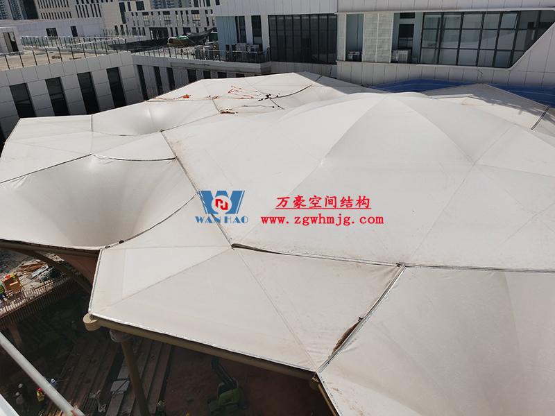ptfe膜結構適用與商業天幕,體育場館,機場,高鐵站等大跨度結構或造型多變的雙曲面結構,常用于屋面圍護結構,其特點材質輕盈受張拉強度高,表面自潔性能好,有相對的透光率,對于傘狀反吊模式的安裝常見于膜面在底下,結構在上層。