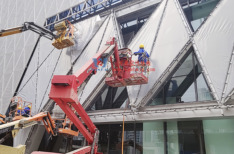 該項目現階段東側與西側膜材均已安裝完畢,西側內膜與鋁扣板也已安裝完成,東側內膜正在緊抓時間節(jié)點,進行安裝中。目前總工程量已完成90%左右,施工人員正在緊鑼密鼓地進行安裝調試中,期待整個工程的完工,來領略它別致的風采。