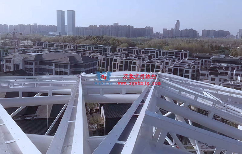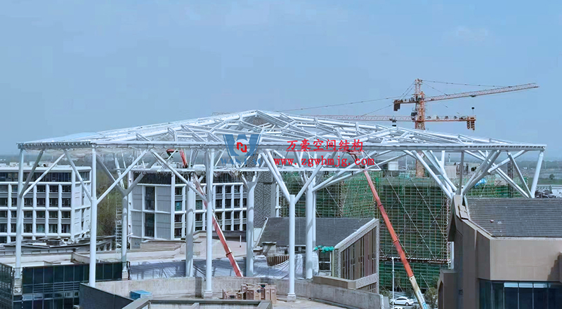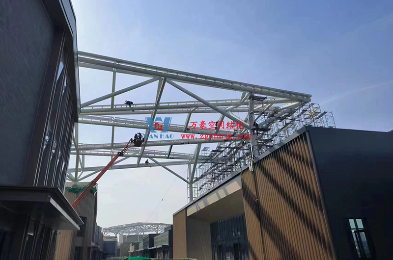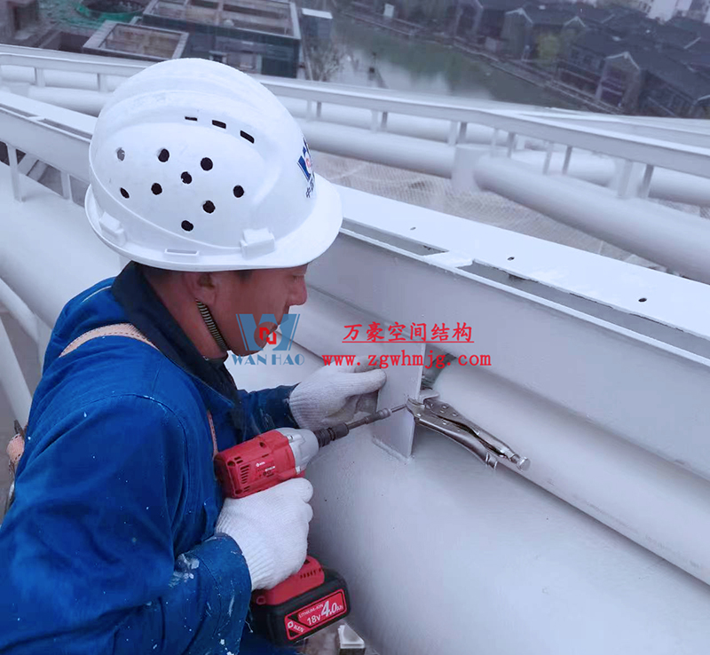 文一塘溪津門天幕鋼結構及ETFE氣枕膜工程由寧波萬豪空間結構工程有限公司承建,該項目用鋼量900噸,膜結構展開面積7000平米。今年以來,萬豪施工團隊緊抓時間節(jié)點,工程進度推進迅速。