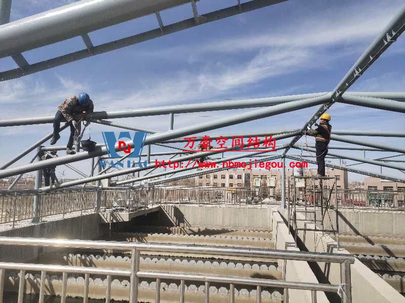 該工程主要建設格爾木工業園昆侖工業區工業污水處理廠首期2.5萬立方米/天工程二沉池、水解酸化池和預沉池池體保溫膜結構安裝。項目用鋼量230噸,膜結構展開面積5000平米。