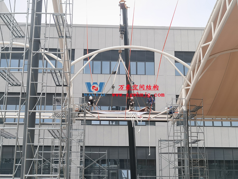 浙江真愛毯業科技有限公司廠房三屋面膜結構工程位于浙江省金華市義烏蘇溪鎮高新區EQ-04-09地塊,該項目用鋼量約560噸,ptfe膜結構展開面積約11000平米。